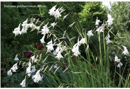 Dierama pulchurrimum ‘White’ is a sweetheart of a mid-summer bloomer that prefers not to be crowded by other plants. Any work required (full sun, rich soil, regular water) pays off with music of celestial beauty. What can I say, see the picture below.