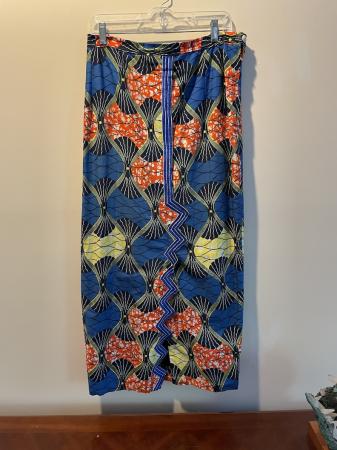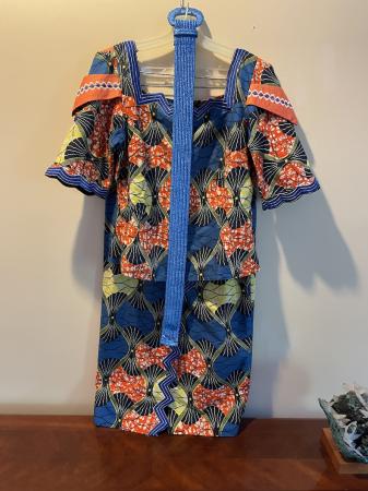 I purchased this outfit 20 years ago at the Rose Festival in Portland. Made by hand by a woman who immigrated from Africa. Beautiful details. Entire piece is lined. The belt was not part of the original ensemble, but added for fun. Size 10. $70
