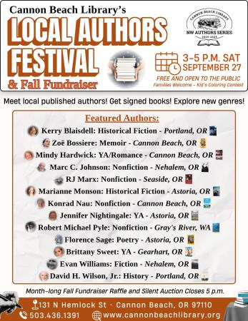 Join us at the Cannon Beach Library THIS Saturday, September 27th from 3 to 5 p.m. for our first Local Authors Festival, hosted as part of the library’s NW Authors Series. It will be an inspiring afternoon featuring 12 published local authors from Nehalem, Cannon Beach, Astoria, Gearhart, Portland, and Washington, all eager to meet readers, sign books, and share their stories. Whether you’re a fan of fiction, non-fiction, poetry, or children’s books, you’ll have a chance to discover new genres and voices.