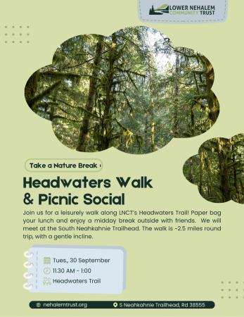 Meet us at 11:30AM at the South Neahkahnie Trailhead for a walk down LNCT’s Headwater’s trail to our stewardship benches. Paper bag your lunch and enjoy a midday break outside with friends. The walk is ~2.5 miles round trip, with a gentle incline.