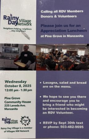 Rainy Day Village Annual Appreciation Luncheon, Weds, Oct 8th, 12pm @ Pine Grove