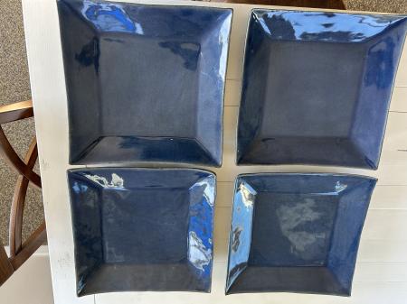 Set of four used William Sonoma blue square dinner plates made in Thailand. Average 12-1/2” square. Minimal wear. $72 or OBO. Email, call or text for inquiry. 503-351-8383. Thank you.