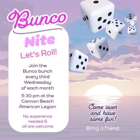 Bunco is Back! Posted on October 11, 2025October 11, 2025 by North Coast BBQ Submitted By: lauren_mills@mac.com – Click to email about this post Bunco Nite is back at the Cannon Beach American Legion—October 15th at 5:30 pm.