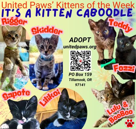 It’s a “Kitten Caboodle” over at United Paws! Kitten season is nearing a close, but we still have a bundle of irresistible kittens available for adoption that are sure to bring entertainment and warmth to your home. These kittens have been socialized in loving foster homes, vaccinated and spayed/neutered.