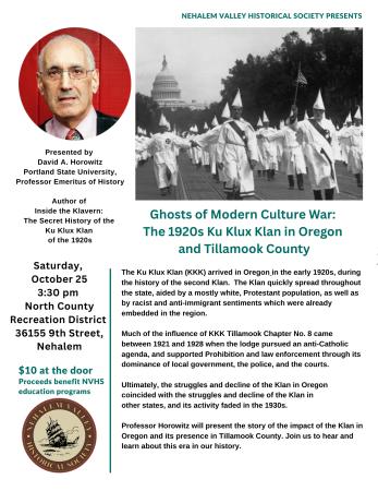 NVHS is proud to present PSU Professor of History Emeritus, David Horowitz. He will give us the history of the Ku Klux Klan in Oregon and, specifically, in Tillamook County. In these times, this is topic that should grab everyone’s interest. NCRD Performing Arts Center on October 25 at 3:30. $10 at the door.