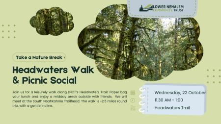 We will meet at 11:30AM at the South Neahkahnie Trailhead for a walk down LNCT’s Headwater’s trail to our stewardship benches. Paper bag your lunch and enjoy a midday break outside with friends. The walk is ~2.5 miles round trip, with a gentle incline.