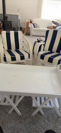 Furniture for sale Posted on October 18, 2025October 18, 2025 by North Coast BBQ Submitted By: dfolgner@gmail.com – Click to email about this post Wooden coffee table and two chairs made from bamboo, dark blue and white striped cushions