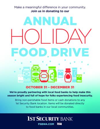 1ST Security Bank is hosting their annual holiday food drive to support our local food bank and pantry. 715 Laneda Ave~! 10/31-12/31