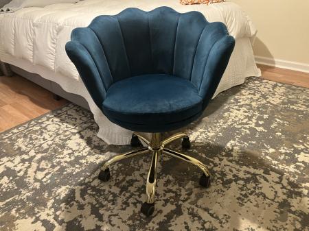 Cute velvet, scalloped-edged, teal swivel office chair to add some comfort n style to your work day. $55 bought as a gift but it was the wrong size.