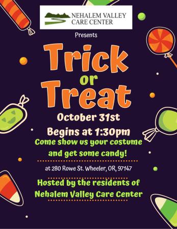 Halloween Trick or Treat at Nehalem Valley Care Center! Come show the residents and staff your costumes and get some candy! Starts at 1:30 just inside the front door. If nobody is there later in the day, come to the nurses station!