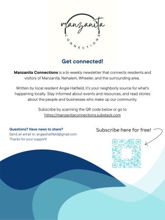 Manzanita Connections is a free biweekly newsletter sent to your email box. It includes news and updates about local events, businesses, people, nonprofits, restaurants, etc., in the Nehalem Bay area. You can read this week’s and past weeks’ editions, as well as subscribe here: