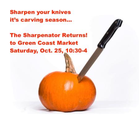 The Sharpenator returns to Green Coast Market this Saturday, October 25 from 10:30AM – 4PM. Bring your knives, scissors, axes, yard tools and pumpkin carving accessories!