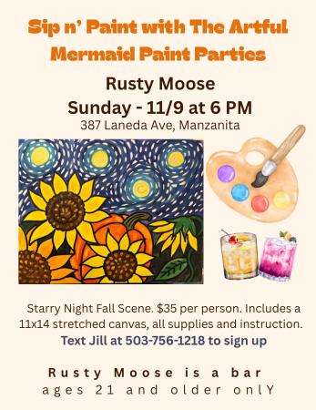 Join us for the premier of Sip n’ Paint at Rusty Moose in Manzanita. Jill from The Artful Mermaid Paint Parties will guide you through a painting experience of Starry Night Fall Scene. No experience necessary.