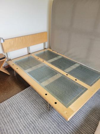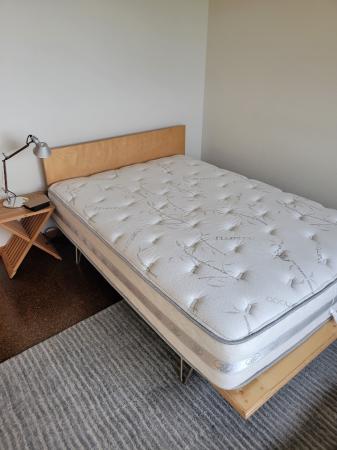 Very nice full size platform wood bed frame w/ headboard. Mattress is a “Bamboo” brand, 12″ padded top – all in great shape.