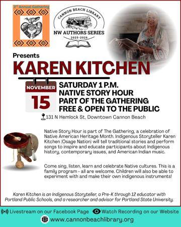 1PM – Native Story Hour with Karen Kitchen @ The Cannon Beach Library (131 N Hemlock, Cannon Beach, OR 97110)
