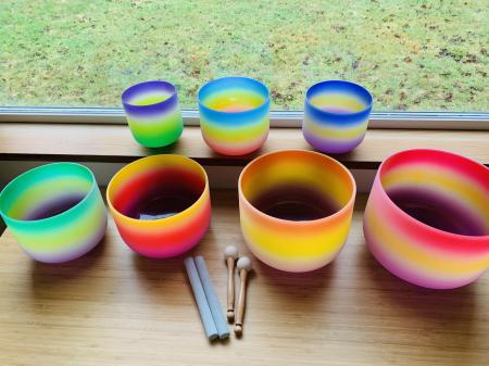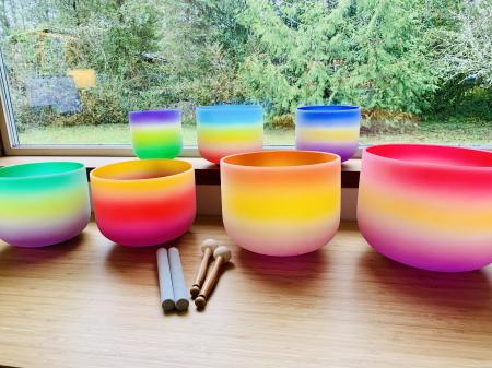 For Sale: 7 Chakra-Tuned Rainbow Frosted Quartz Crystal Singing Bowl Set. 6” — 12” 432 Hz