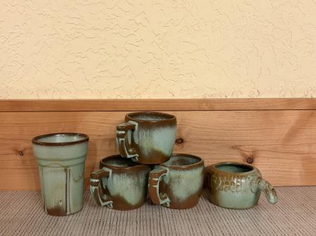 This is Frankoma Pottery Plainsman coffee mugs, wagon wheel tumbler and creamer/sugar bowl in the “Prairie Green” glaze color.