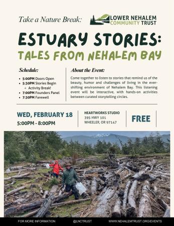 Join us at HeartWorks Studio in Wheeler on Wednesday, February 18th to listen to stories that remind us of the beauty, humor and challenges of living in the ever-shifting environment of Nehalem Bay! This listening event will be interactive, with hands-on activities between curated storytelling circles. Bring your family and friends for a cozy evening of laughter and wild tales from home.