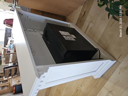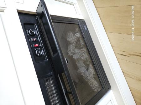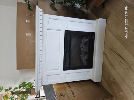 Free. White fireplace mantel for electric heater that pretends to be a fireplace. Mantel is in excellent condition. Heater works, but the buttons are odd – turn switch to Off position in order to turn heater On.