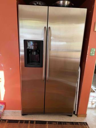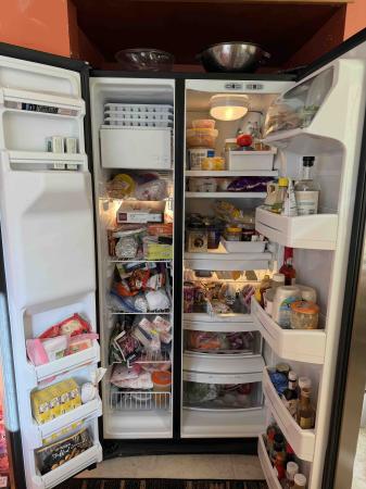 The GE fridge is a side by side, counter depth unit that holds a lot of food! The water dispenser and ice maker are non-functional, but the food stays frozen/cold. It’s still pretty enough for a kitchen or could be a nice garage fridge.