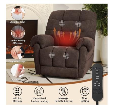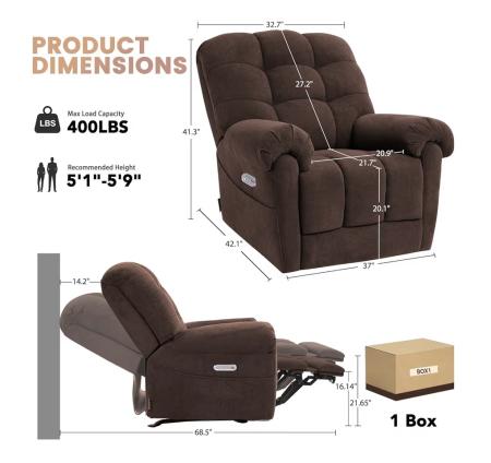 * Multifunctional Smart Features for Easy Use: One-touch reset: Press the “HOME” button to return the chair to the upright position in seconds, simple to operate and helpful for extending motor lifespan. Fast charging: Side-mounted USB and Type-C ports keep your phones, tablets, or other devices powered up while you relax. Heat & massage: 8 vibrating massage motors (29V) are embedded in 4 zones (shoulders, lumbar, thighs, calves), with 4 vibration modes, 3 intensity levels, and 3 timer settings (10/20/30min) adjustable via remote.