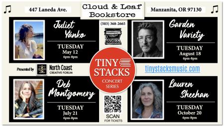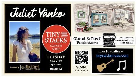 On May 12, Manzanita favorite, Juliet Yänko is excited to be kicking off the inaugral season of Cloud & Leaf’s “Tiny Stacks Concert Series,” hosted by Holly Lorincz, and presented in partnership with North Coast Creative Forum.