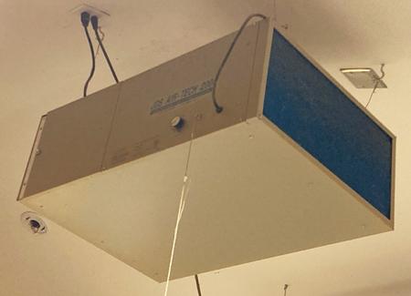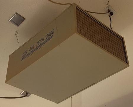 JDS Air Tech 2000 air filtration unit for the woodworking shop. It filters about 99% of particles down to 5 microns and 91% down to 1 micron. It has a two-speed pull chain switch that controls a 1/3 hp motor. The filter can be ceiling mounted. Good condition.