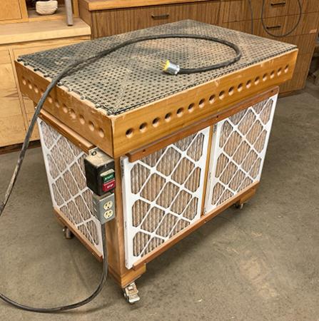 Downdraft vacuum sanding table for sale. Works great. Cabinet is 24 W x 36 L x 35 H. Motor is 120 volt, 1720 RPM, single phase. Has on-off switch and outlets for sanders. Six replaceable filters are 16 x 20 x 1 and are easily replaceable. Four swivel casters, two locking.