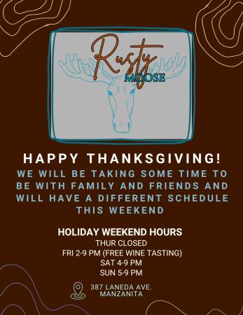 Dixie’s Vino will be open Tuesday, Wednesday, and Thursday, November 25th, 26th and 27th (Thanksgiving Week). I am open noon to 5pm except on Thanksgiving Day I will be open 11-3pm. I will be closed after that until Tuesday, December 9th to spend time with my family.