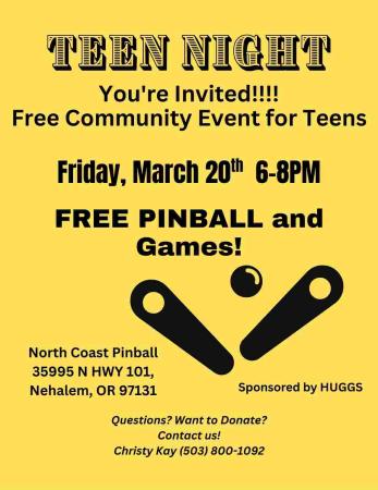TEEN NIGHT at North Coast Pinball is this Friday March 20th, 6-8 PM. FREE PINBALL and Games, Arts/Crafts for ALL TEENS!! ALL TEENS WELCOME! (Teens Only) Please spread the word and send your teens in for FREE FUN!