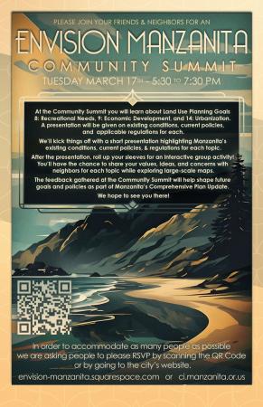 Envision Manzanita Community Summit on March 17, from 5:30 to 7:00 pm
