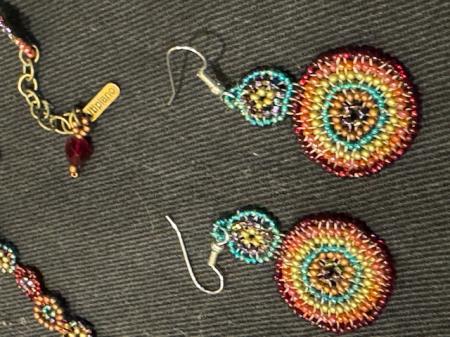 Beaded Pierced Earrings with matching Beaded Necklace. Multi-color. Beautiful and intricate handwork, I got these as a gift but just not my style. These need to be worn!