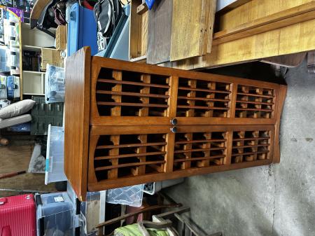 It about 2 feet wide, 20 inches tall, 7.5 inches deep. I paid over a hundred for it in a camas,wa antique shop. I just can’t find a functional space for it in my current downsized studio.