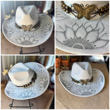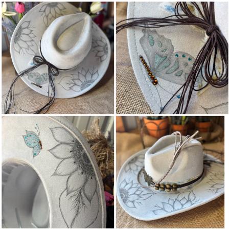 Elevate your style with this hand-burned hat featuring an intricate sunflower and butterfly design.