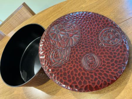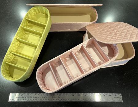 Boxes as shown, mid-century vintage satin quilted lingerie organizers, perfect condition—$55 for the collection.
