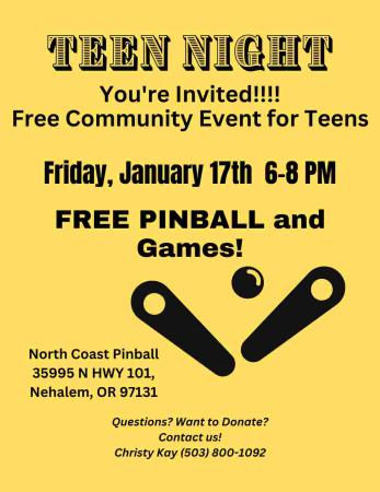 TEEN NIGHT at North Coast Pinball is this Friday January 17th, 6-8PM. FREE PINBALL and Games for ALL TEENS. ALL TEENS WELCOME. Please spread the word and send your teen for some FREE FUN!