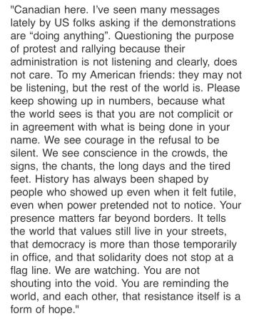 And that’s what this letter is about — joining my voice in protest, with my neighbors and friends and community, of a president (no capital “p” — he doesn’t deserve it —) and an administration that has robbed us of our trust in our government to do what is right for us — all of us in our community and state and country and the world. We are a young country of immigrants, and we’re being shaken to our core. I do believe today there are encouraging signs that what we are doing in rising up against all the injustice is making a difference. May our hearts rest in the peace and knowledge that all will be well, however long that may take, and that we will find the courage to carry on together.