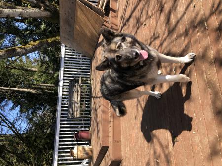 She looks like a wolf. She is a malamute husky mix and very sweet, not dangerous. She is very timid with people and may be reluctant to come near if you try to approach her quickly. If you make yourself seem small and kind she may come closer. She is playful outside and nervous inside.