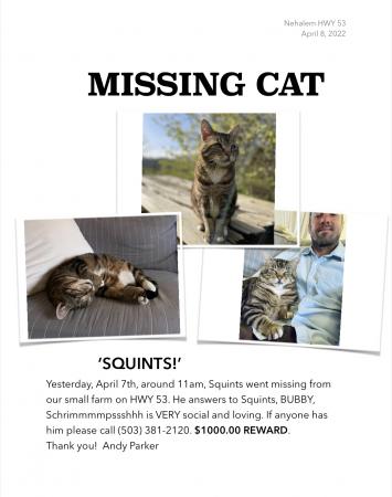One year old brown tabby with white paws missing since last night from Neptune way by elk meadows in bayside gardens. He’s not micro chipped but he’s been with me since he was a kitten. Does not respond to the name wiley. Hoping he found some shelter from the rain and just got stuck inside somewhere…Please call /text /email if you see him! 541-418-2281 or Carolina@corvuslanding.com