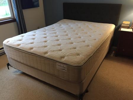 Queen mattress, box spring, with sturdy metal frame and tufted navy adjustable headboard. Clean, gently used about 2 years. FREE”