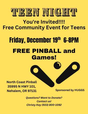 TEEN NIGHT at North Coast Pinball is Friday December 19th, 6-8PM. FREE PINBALL and Games, Arts/Crafts for ALL TEENS. ALL TEENS WELCOME(teens only!)