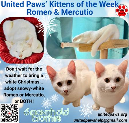 Romeo and Mercutio were abandoned as tiny kittens and rescued by United Paws. They are thriving in their loving foster home and are ready for their forever home.
