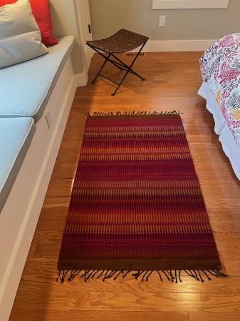 Kimberly Morris is an Oregon artist from Wallowa. She weaves beautiful one-of-a-kind rugs from hand-died New Zealand wool. It takes approximately 3 weeks to weave each unique rug, We bought this rug some years ago from Kim at “Art in the Pearl” in Portland.