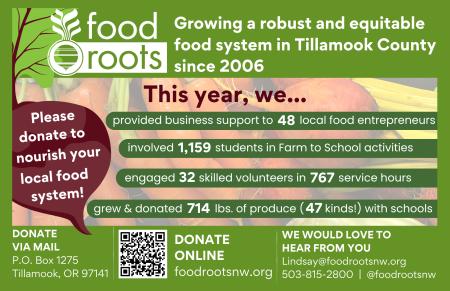 A misprint in the Tillamook County Giving Guide that reached your mailboxes displays last year’s information. We invite you to engage in our actual 2025 showcase with the active QR code, key impacts from this past year, and the email address to be in touch! To all of you who have been involved with us this past year–activity participants, partners, donors, and volunteers–thank you! To those learning about Food Roots, we look forward to connecting with you!