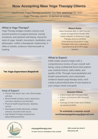 Northwest Yoga Therapy currently has one opening for a new Yoga Therapy client- in person or online.