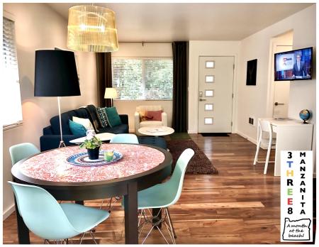 Welcome to 3THREE8 Manzanita ~ a newly remodeled, month-to-month private home retreat in Manzanita, Oregon. Our intimate and modern space is the perfect retreat for those who enjoy high end furnishings in a comfortable, home-like setting. 1.5 blocks to Laneda Ave (main village with all the shops), 3.5 blocks to the beach with private back yard, fire pit and golf course views. 2 bedroom/1 bath, two person max, one small dog OK w/ additional fee. We cover all utilities – no deposit required. $120 clean fee for our local cleaner. Check in 1/1/26 4PM – Check out 1/31/26 by 11AM.