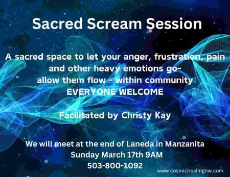 There will be a Sacred Scream Session on Sunday morning, March17th, at 9 AM, on the beach. We will meet on the end of Laneda, in Manzanita and move towards the water, for ceremony