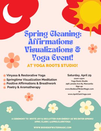 Join me, April, for some yoga & energetic spring cleaning!. We’ll begin with a seated meditation and ceremony to call in positive supportive energies. Next, we’ll move through a 45-minute yoga sequence to get into our bodies & shake off anything leftover from winter.